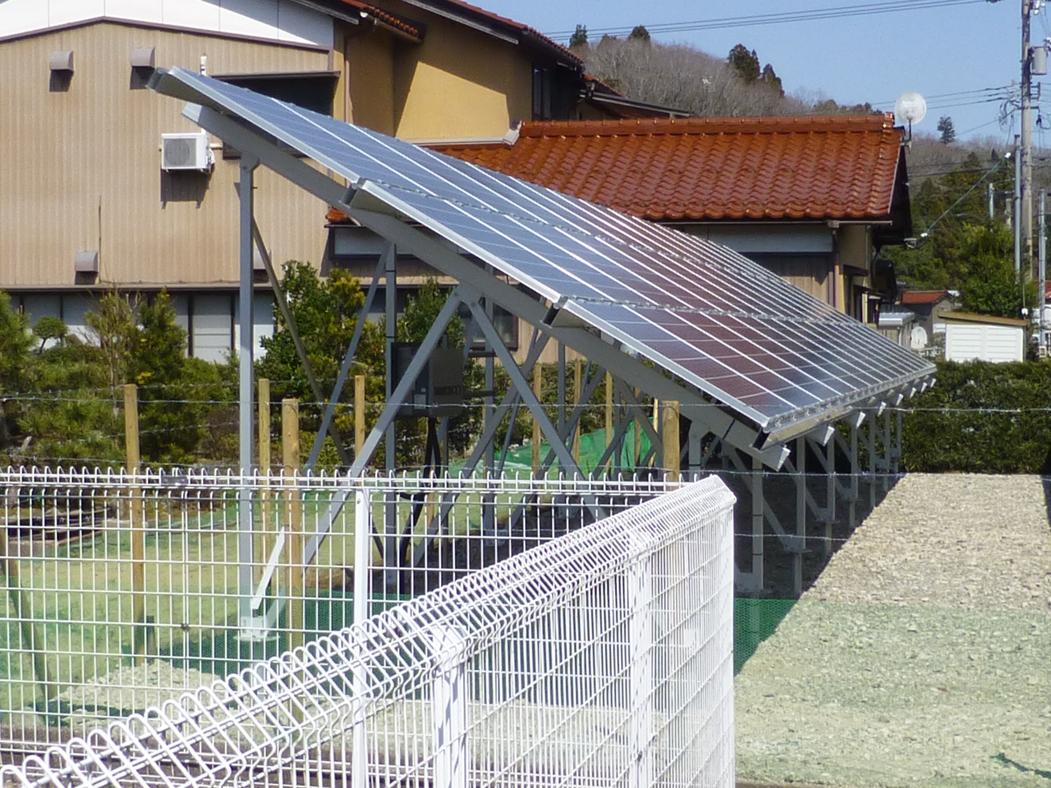 周りは住宅街です。計画にあたっては、近隣、景観、保安に十分配慮しました。近隣についてはコンピューターによる反射光シュミレーションを行いました。その結果に基づいてパネルの設置角度は2種類にしました。景観については、周囲に植樹し、自然に溶け込ませました。保安については、もともとあった周囲の用水路が役立っています。